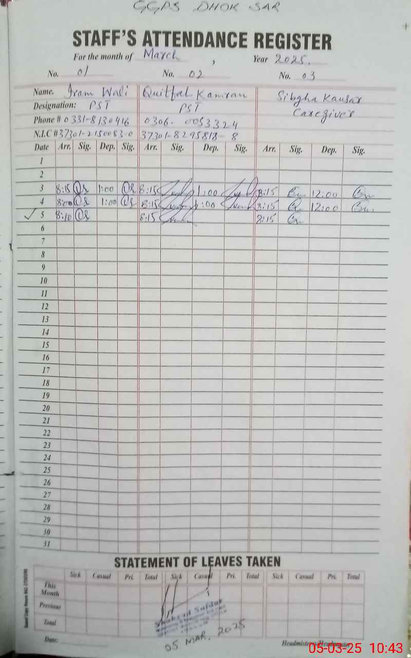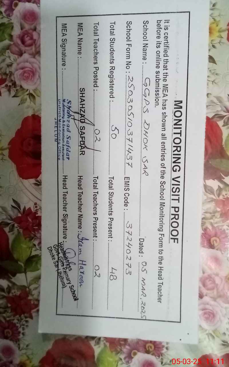| EMIS Code: 37240273 | Name of School: GGPS DHOK SAR | |||