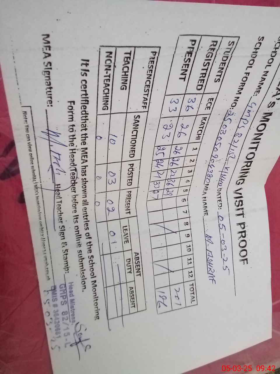| Attendance Register | Head Teacher | MEA with School | Visit Proof |