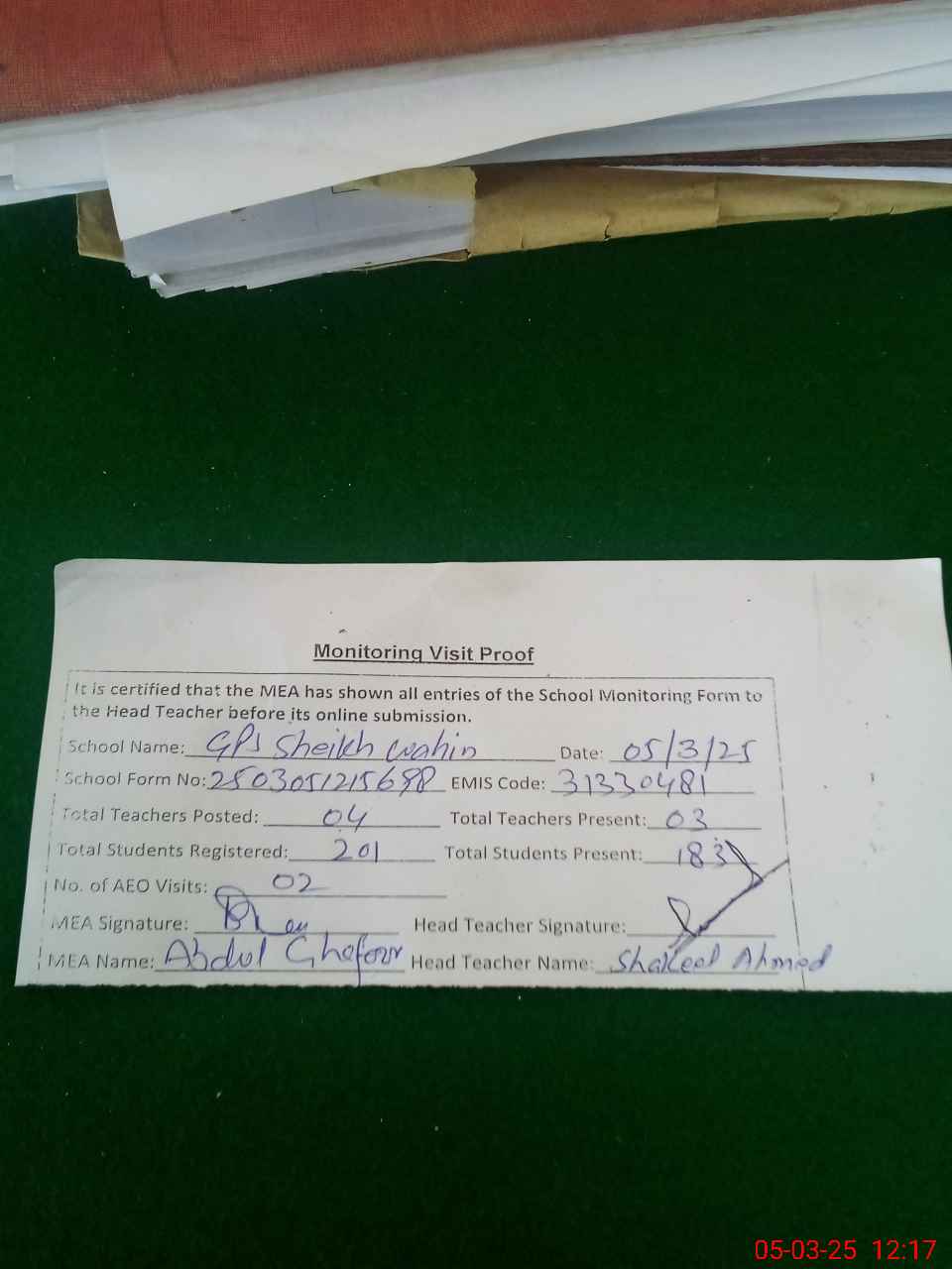 | EMIS Code: 31330481 | Name of School: GPS SHEIKH WAHIN JADEED | |||