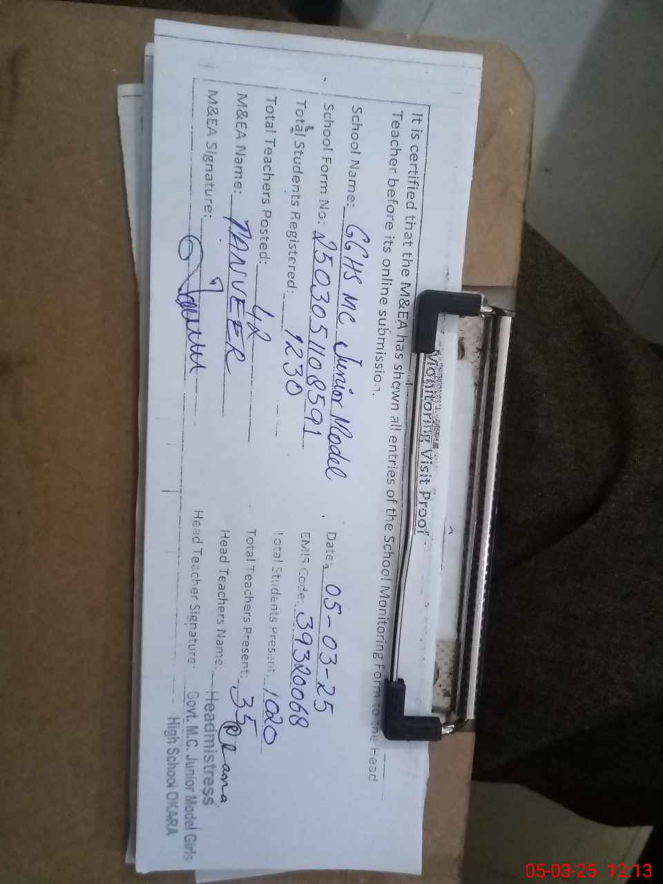 | EMIS Code: 39320068 | Name of School: GGHS MC JUNIOR MODEL OKARA | |||
