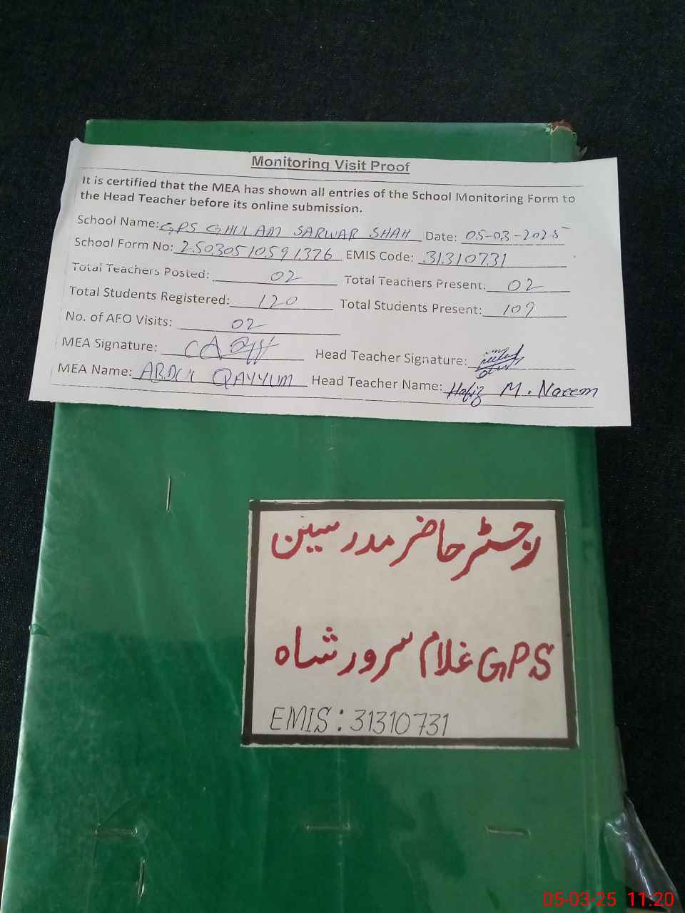 | EMIS Code: 31310731 | Name of School: GPS GHULAM SARWAR SHAH | |||