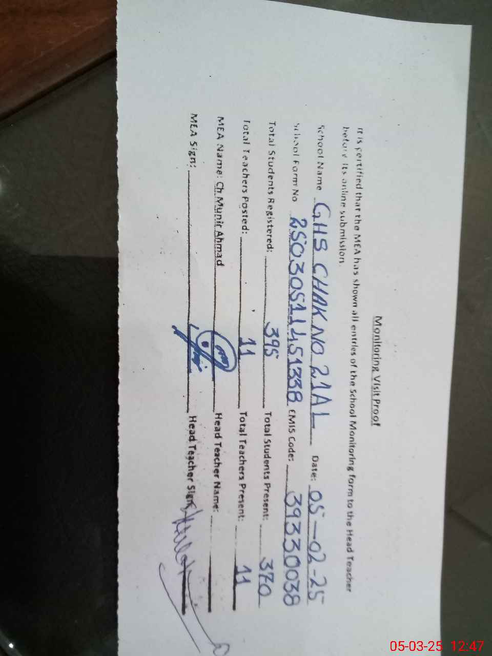 | EMIS Code: 39330038 | Name of School: GHS CHAK NO. 2/1-AL | |||