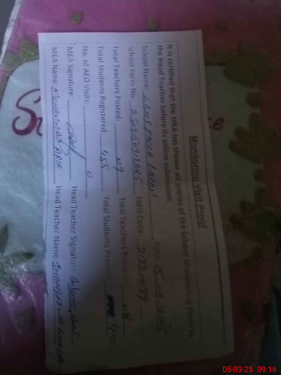 | Attendance Register | Head Teacher | MEA with School | Visit Proof |
