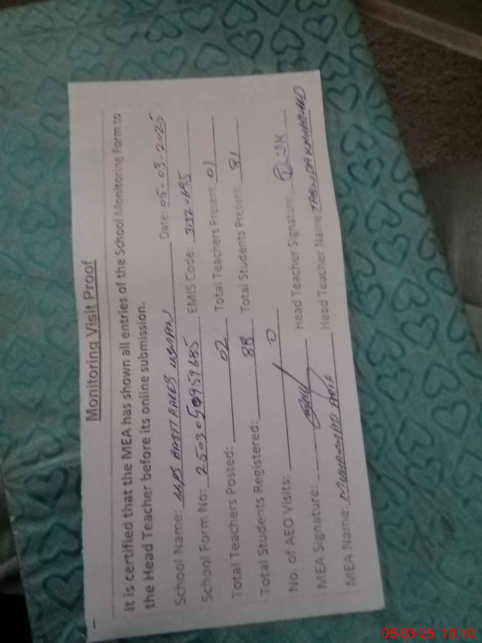 | Attendance Register | Head Teacher | MEA with School | Visit Proof |