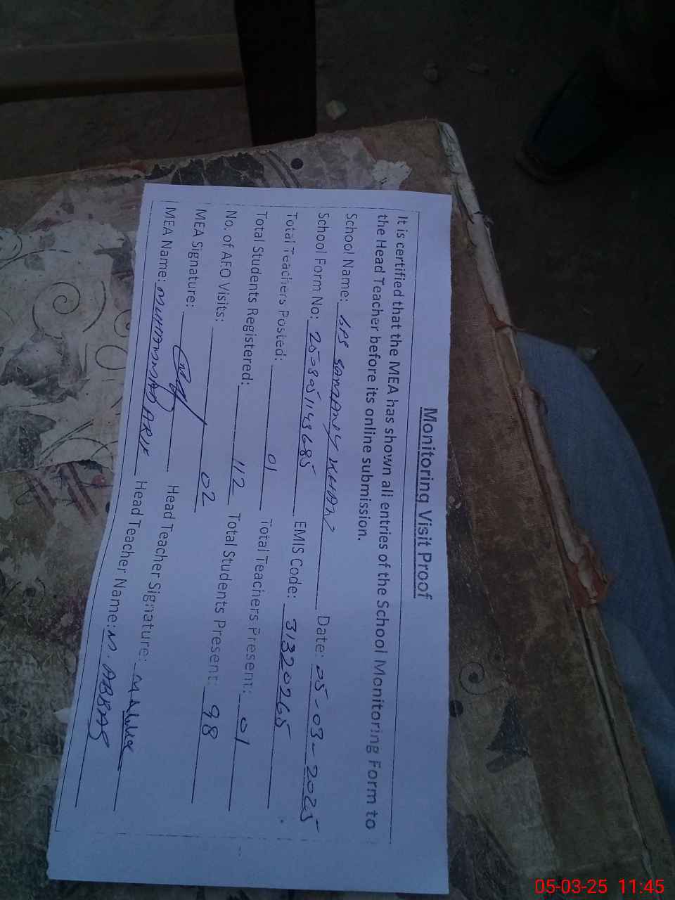 | Attendance Register | Head Teacher | MEA with School | Visit Proof |