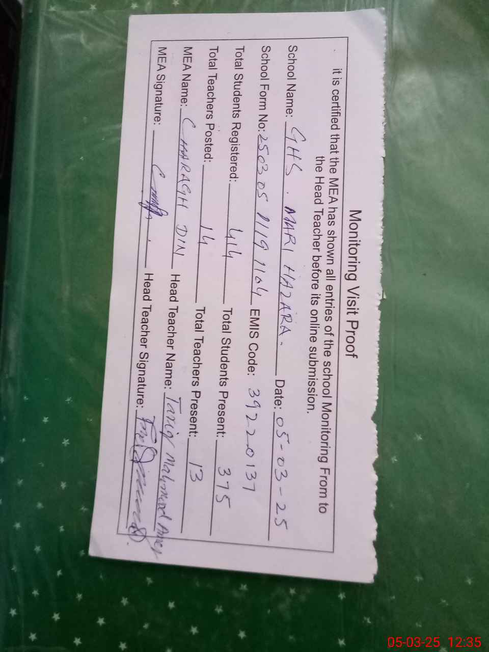 | EMIS Code: 39220137 | Name of School: GHS MARI HAZARA | |||