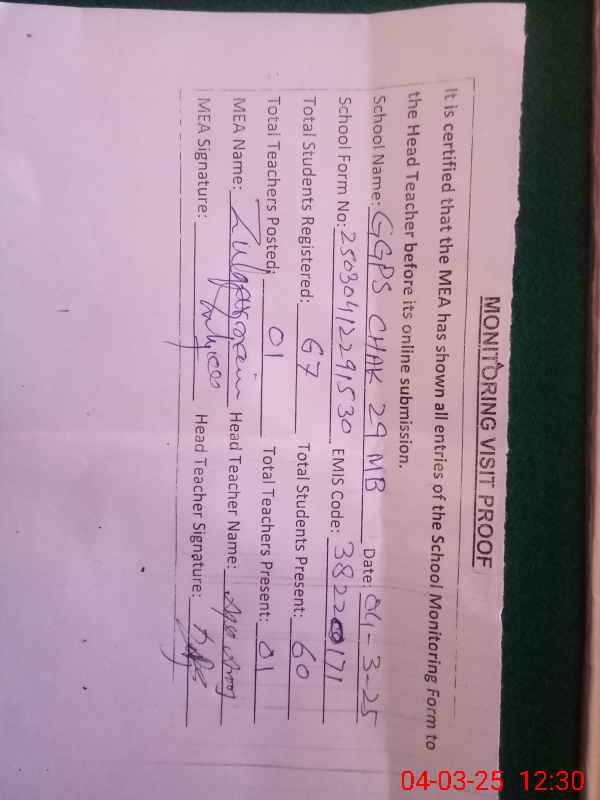 | EMIS Code: 38220171 | Name of School: GGPS CHAK NO 29 MB | |||