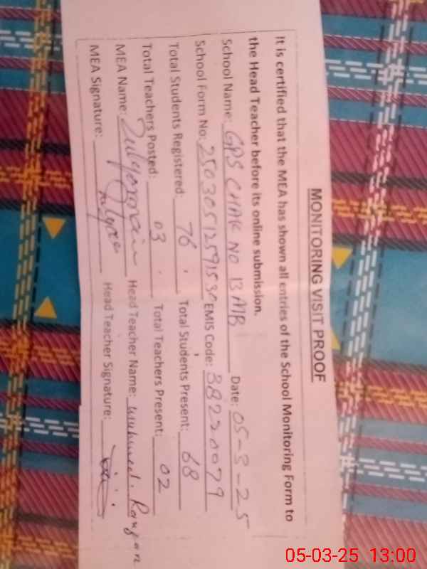 | EMIS Code: 38220079 | Name of School: GPS CHAK NO. 13-A/MB | |||