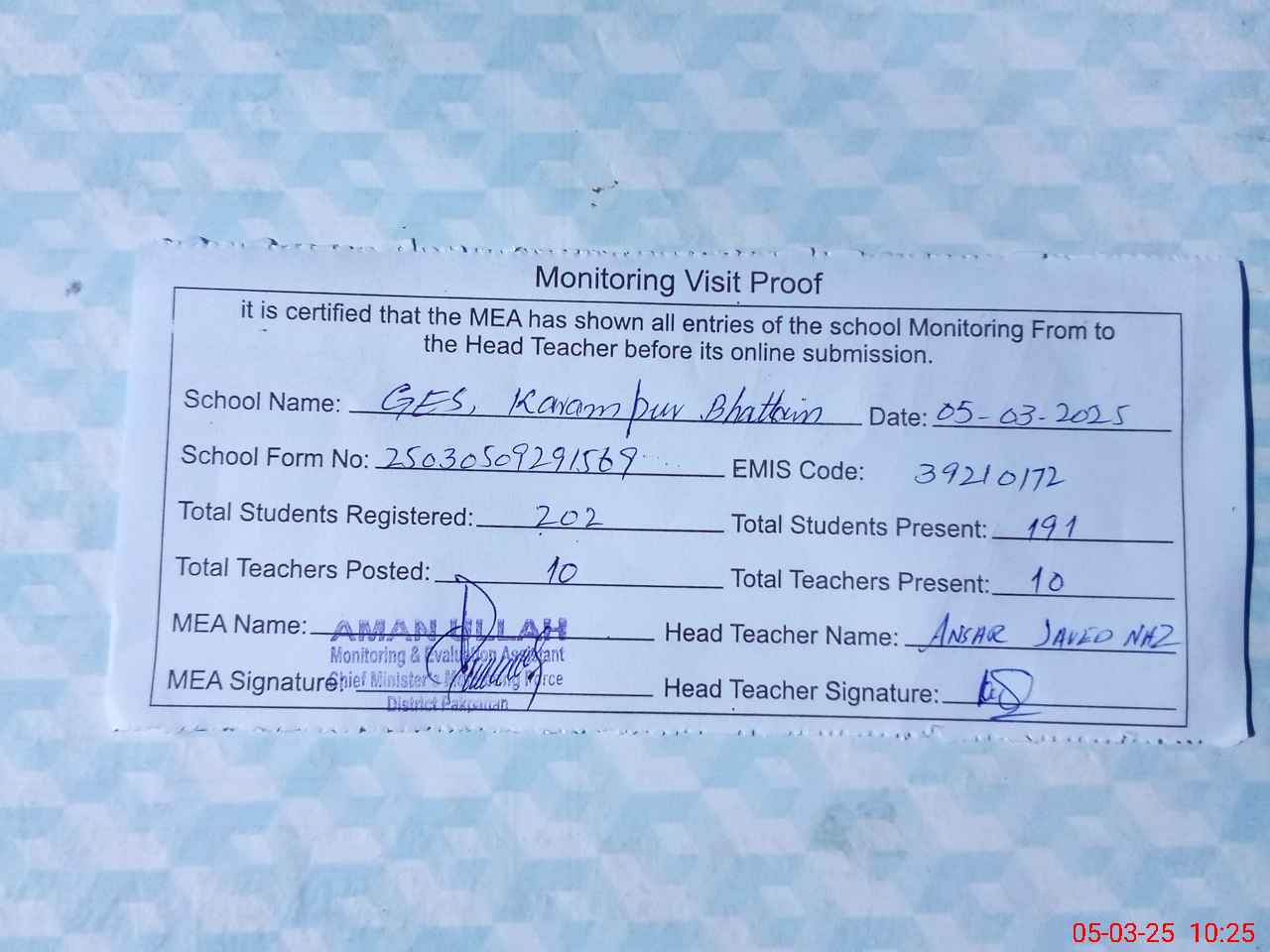| Certified that this School was Inspected by the Undersigned MEA/DMO Today and the Information Stated Above is as Per Record. | |||||