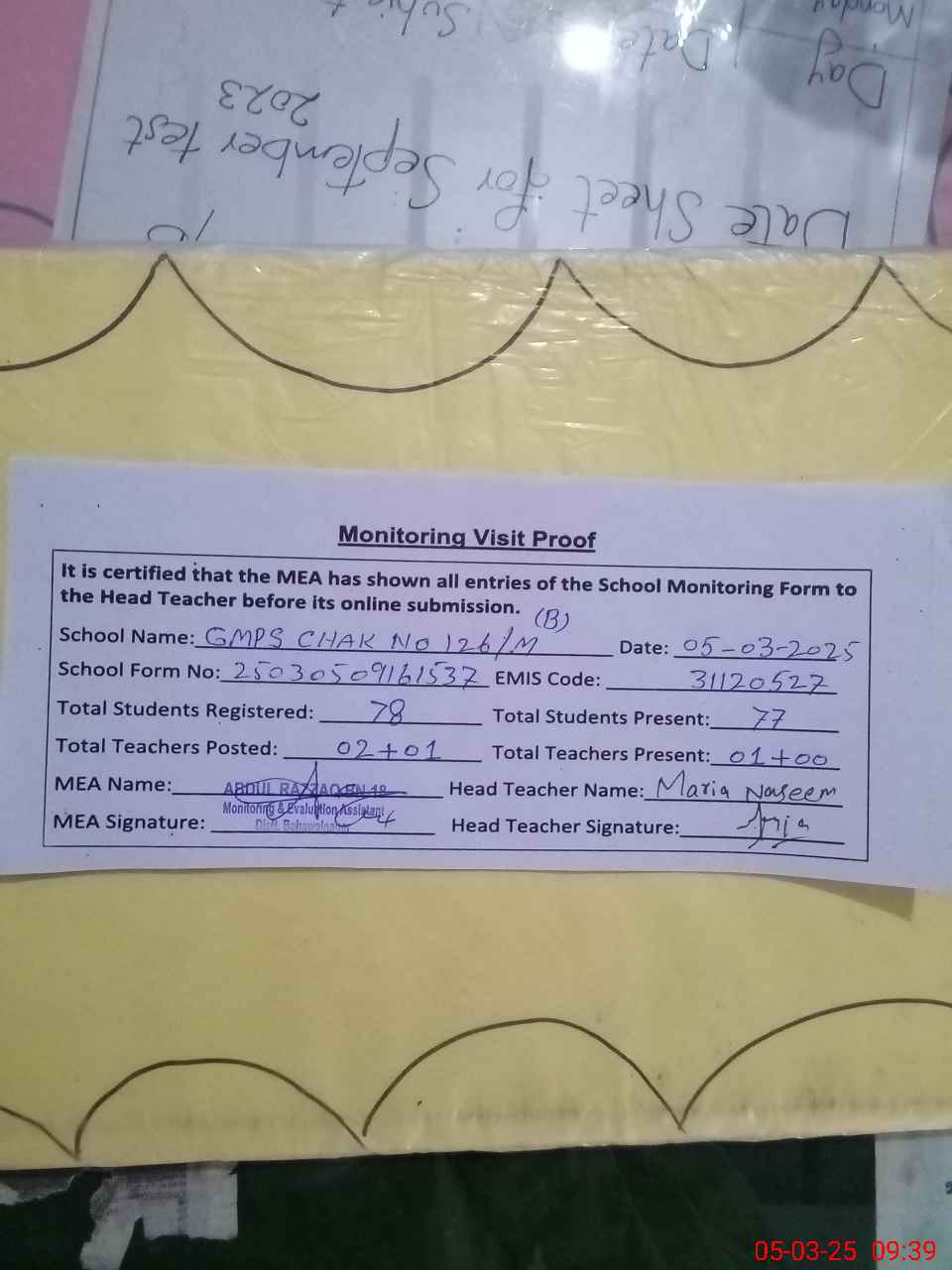 | Attendance Register | Head Teacher | MEA with School | Visit Proof |