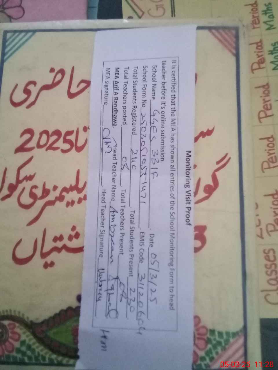| Attendance Register | Head Teacher | MEA with School | Visit Proof |