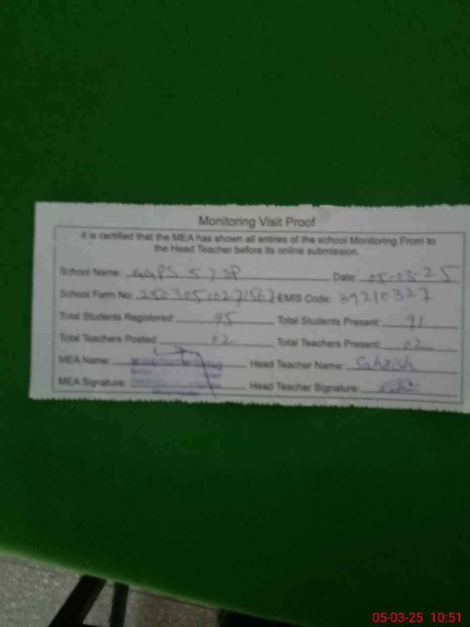 | Attendance Register | Head Teacher | MEA with School | Visit Proof |