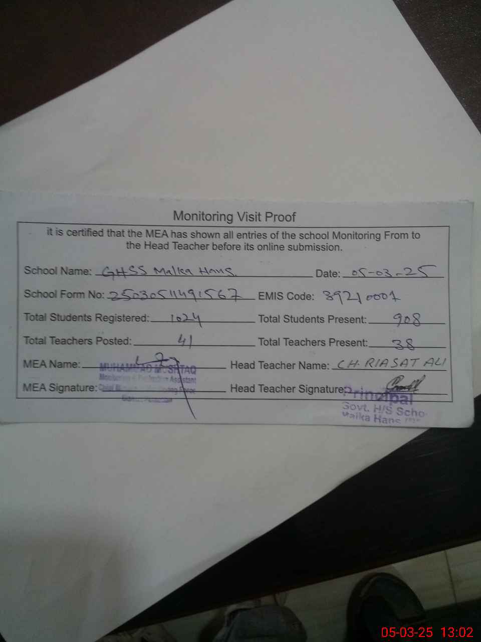 | Attendance Register | Head Teacher | MEA with School | Visit Proof |