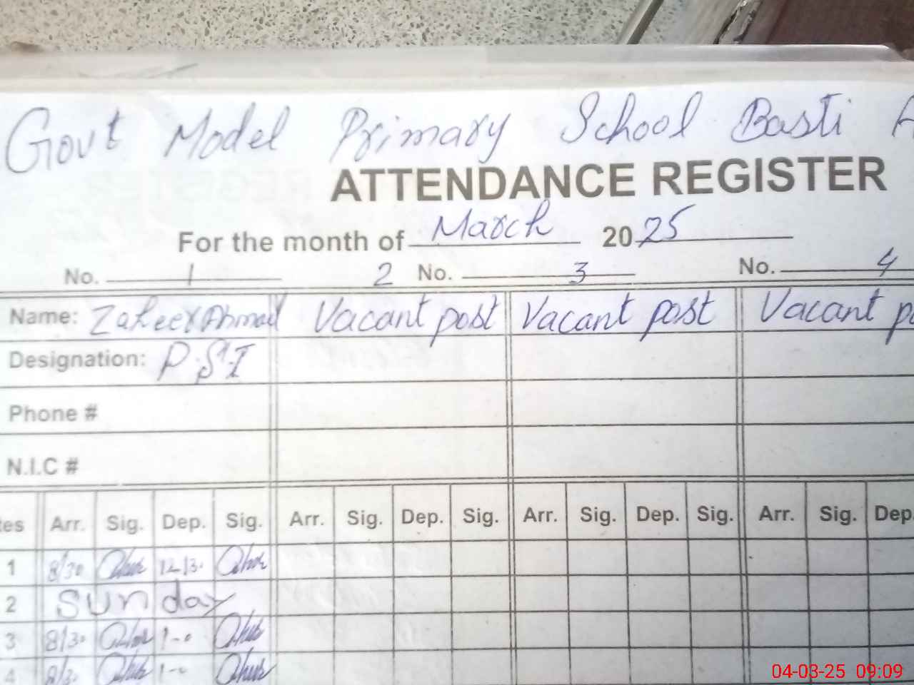 | Name: Za**** Ah**** Designation: (School Headmaster's/Headmistress's) PST Phone/Cell Number: 03**** |