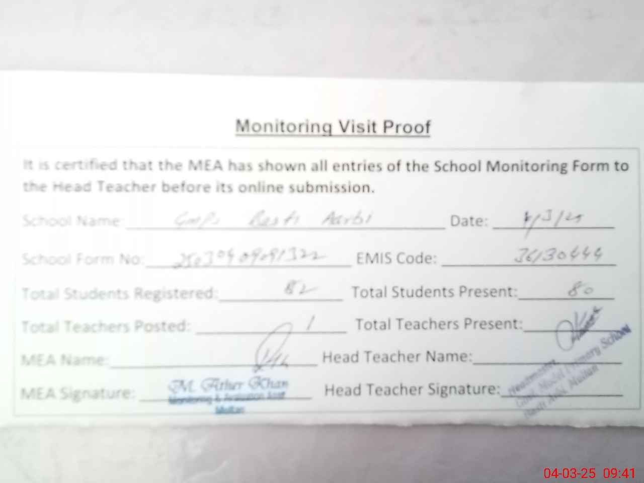 | Attendance Register | Head Teacher | MEA with School | Visit Proof |