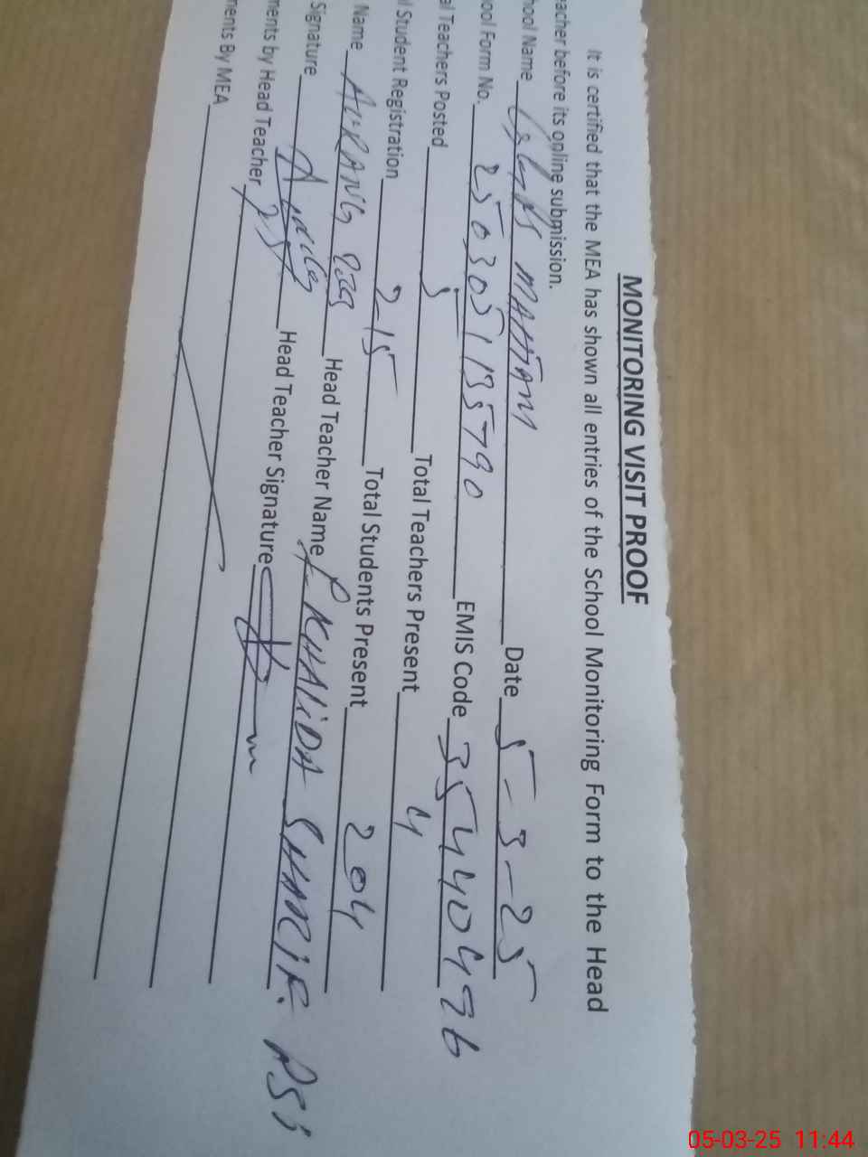 | Attendance Register | Head Teacher | MEA with School | Visit Proof |