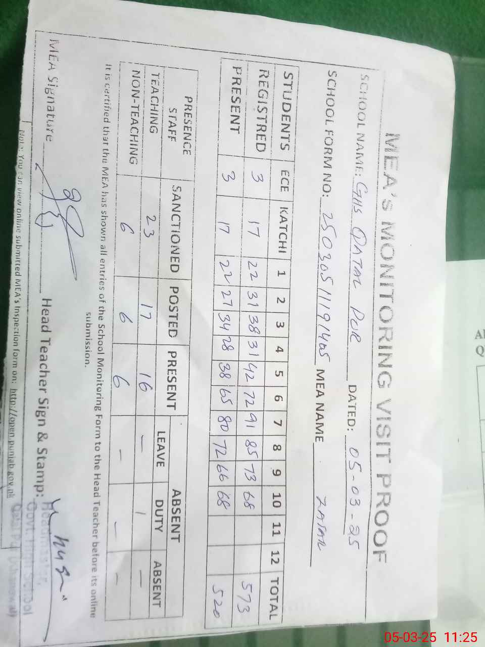 | EMIS Code: 36410020 | Name of School: GHS QATAL PUR, SARAI SIDHU | |||
