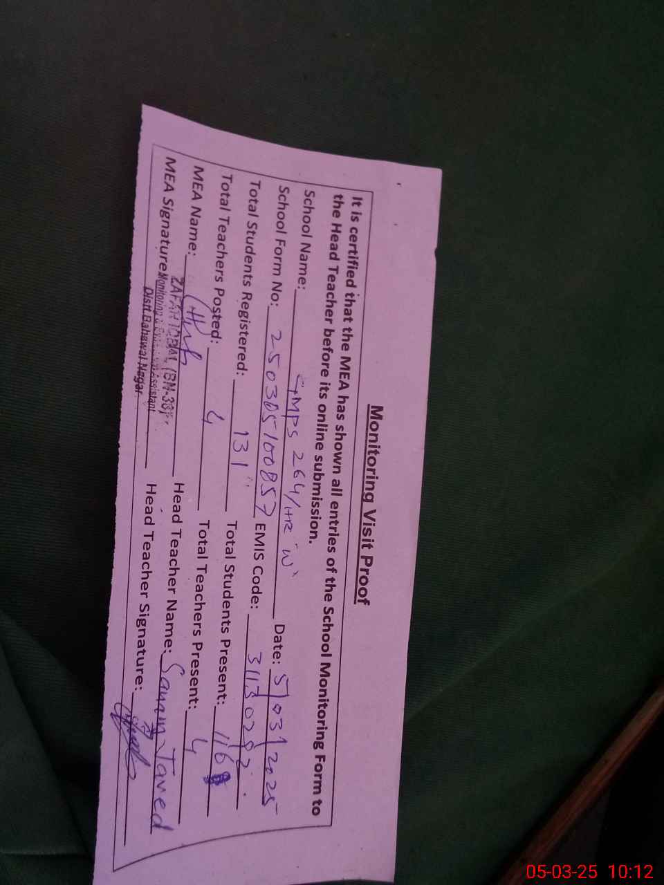 | Monitoring Date: 05-03-2025 | Start Time: 05-03-2025 09:58 AM | End Time: 05-03-2025 10:12 AM | Name of MEA: Za**** Iq**** BN**** | |