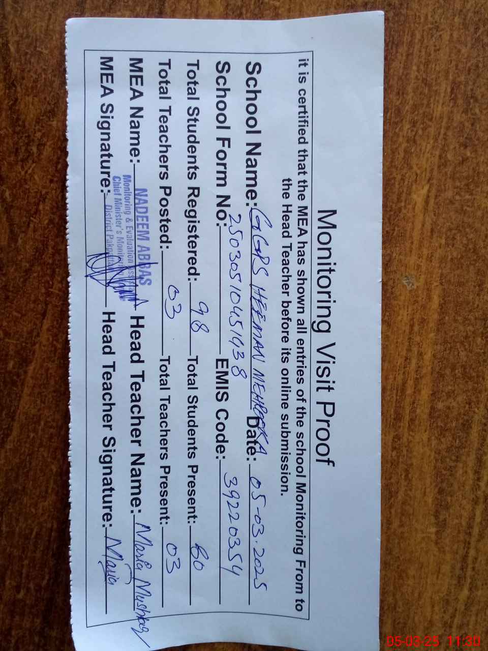 | EMIS Code: 39220354 | Name of School: GGPS HEEMAN MEHROOKA | |||