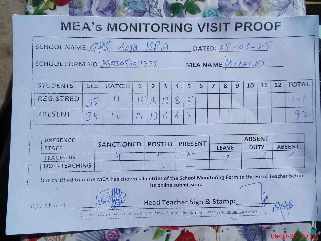 | Attendance Register | Head Teacher | MEA with School | Visit Proof |