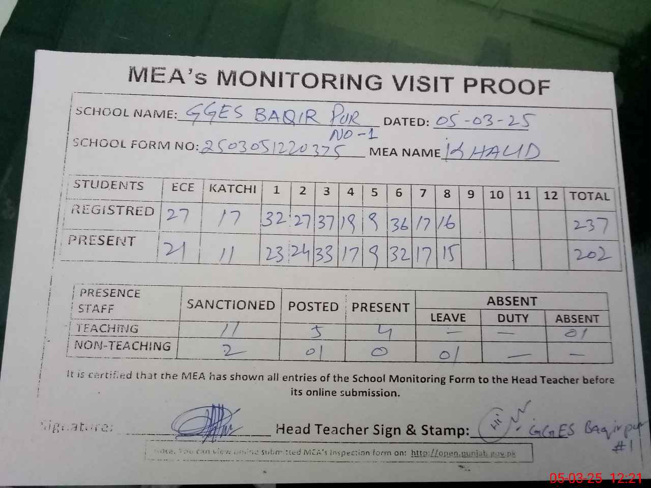 | Attendance Register | Head Teacher | MEA with School | Visit Proof |