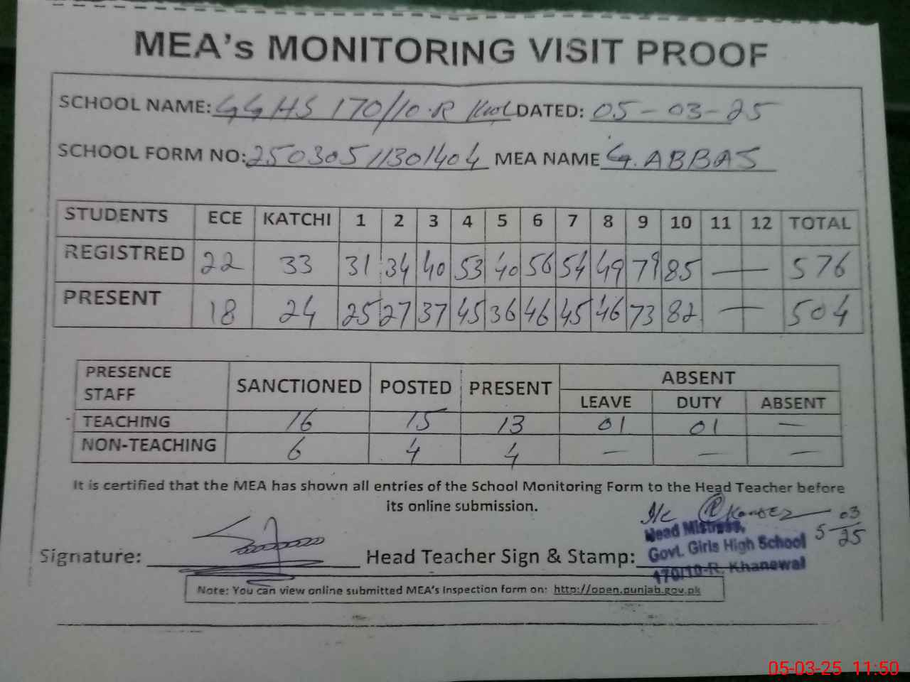 | Attendance Register | Head Teacher | MEA with School | Visit Proof |
