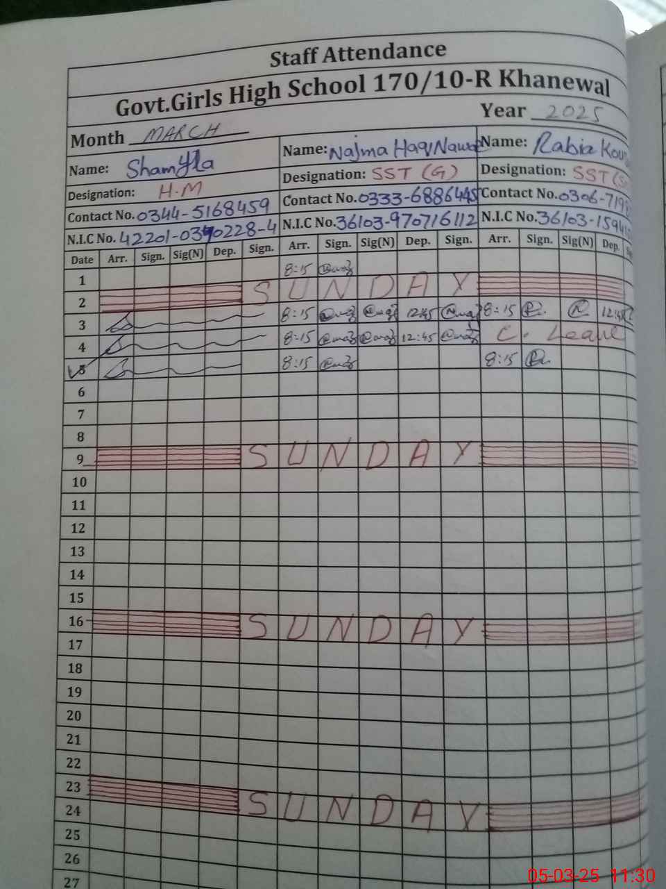 | CNIC | Full Name | Designation | R/C | Absence During Last Calender Month |