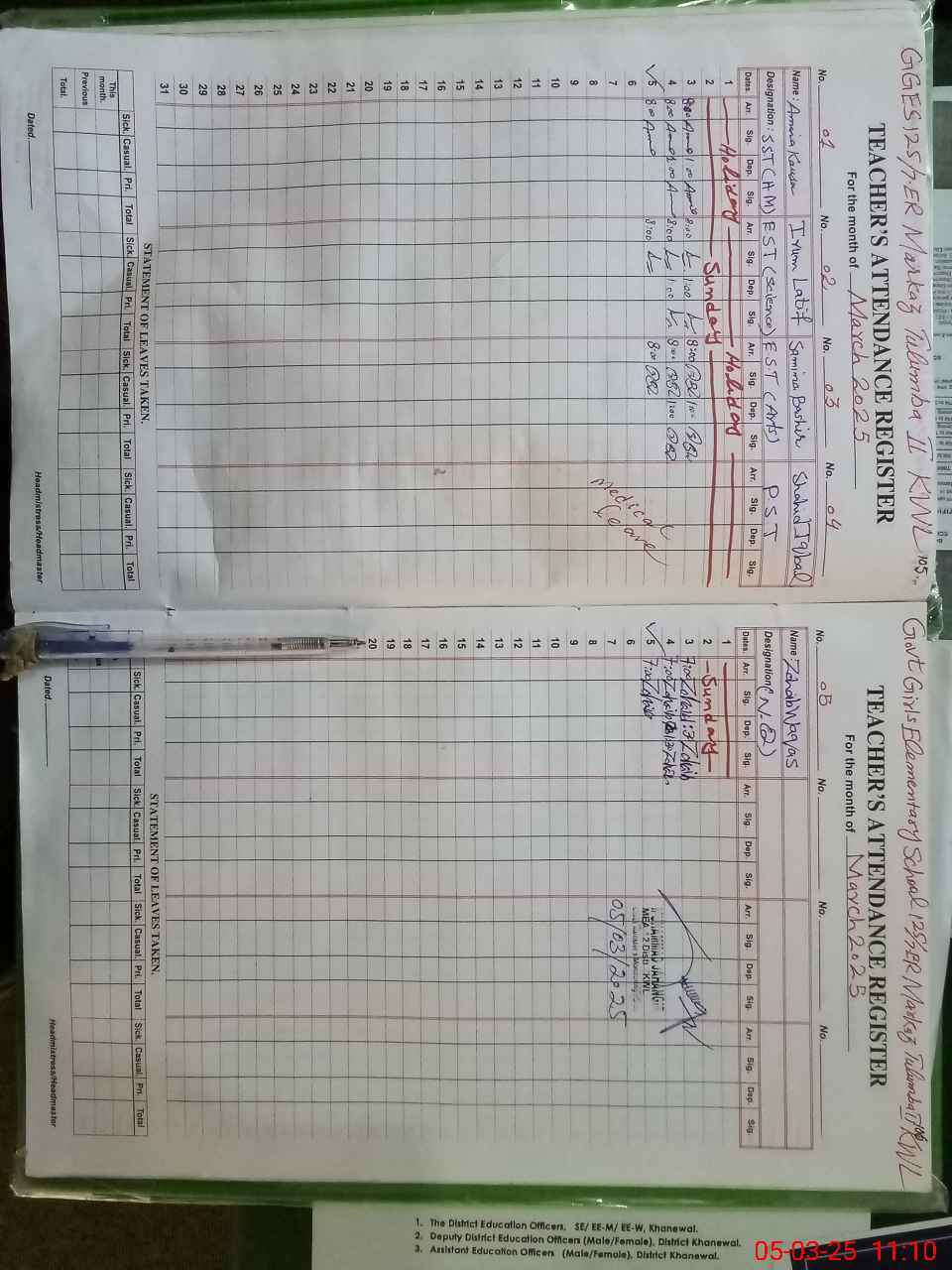 | Remarks (Use Separate Page if Required): SHAHID IQBAL PST FOUND UN AUTHORISED ABSENT FROM DUTY NO MEDICAL LEAVE APPROVED AVAILABLE STARTING FROM 16 FEBRUARY 2025 TO 01 MARCH 2025 FURTHER NO LEAVE PROOF IS AVAILABLE NSB GRANTS AND FTF RECORDS ARE NOT MAINTAINED BANK STATEMENTS ARE NOT AVAILABLE LESSON PLANS ARE NOT AVAILABLE RANDOM CLASS SIX IS NOW PASSED OUT FROM THIS SCHOOL | |||||