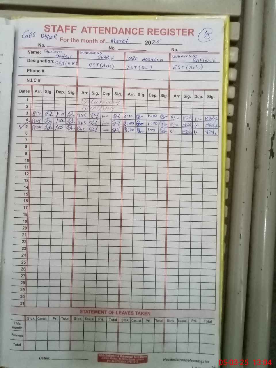 | Name: Mu**** Sh**** Designation: (School Headmaster's/Headmistress's) EST Arts Phone/Cell Number: 03**** |