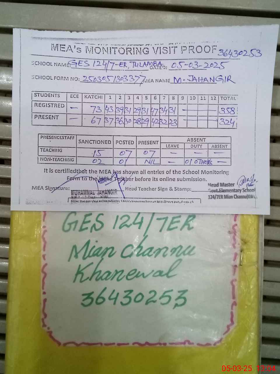 | Attendance Register | Head Teacher | MEA with School | Visit Proof |