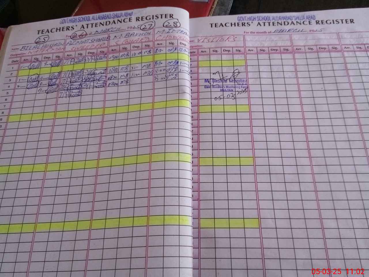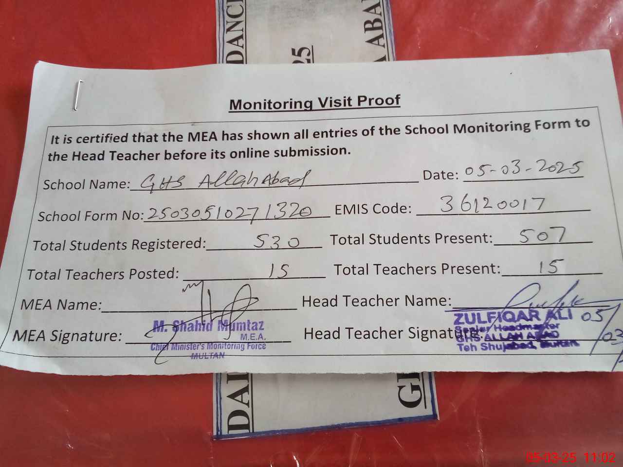 | Attendance Register | Head Teacher | MEA with School | Visit Proof |