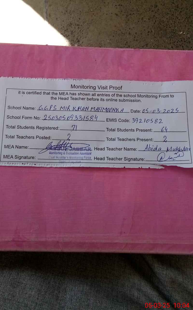 | EMIS Code: 39210582 | Name of School: GGPS MIR KHAN MAHMOONKA | |||