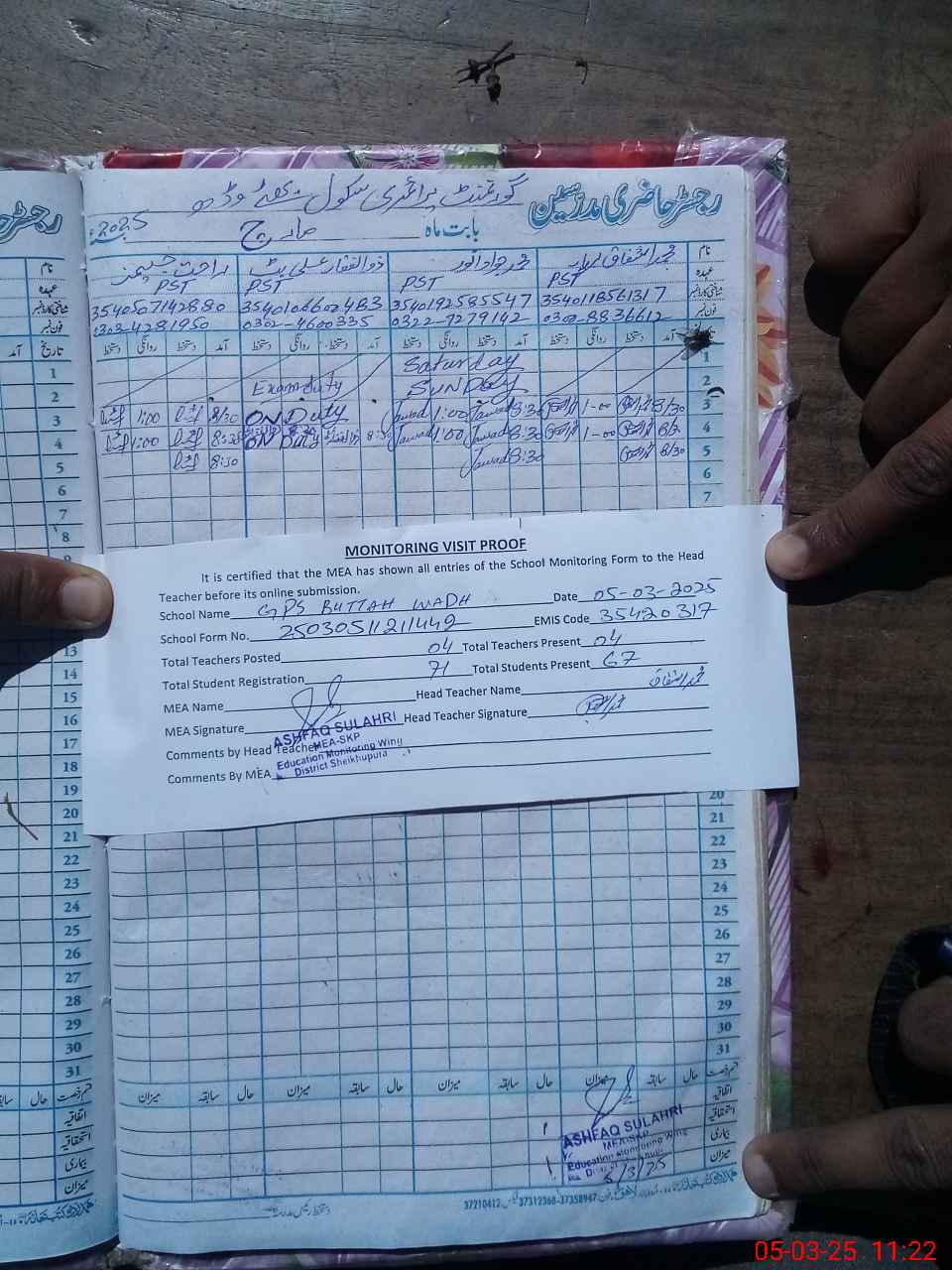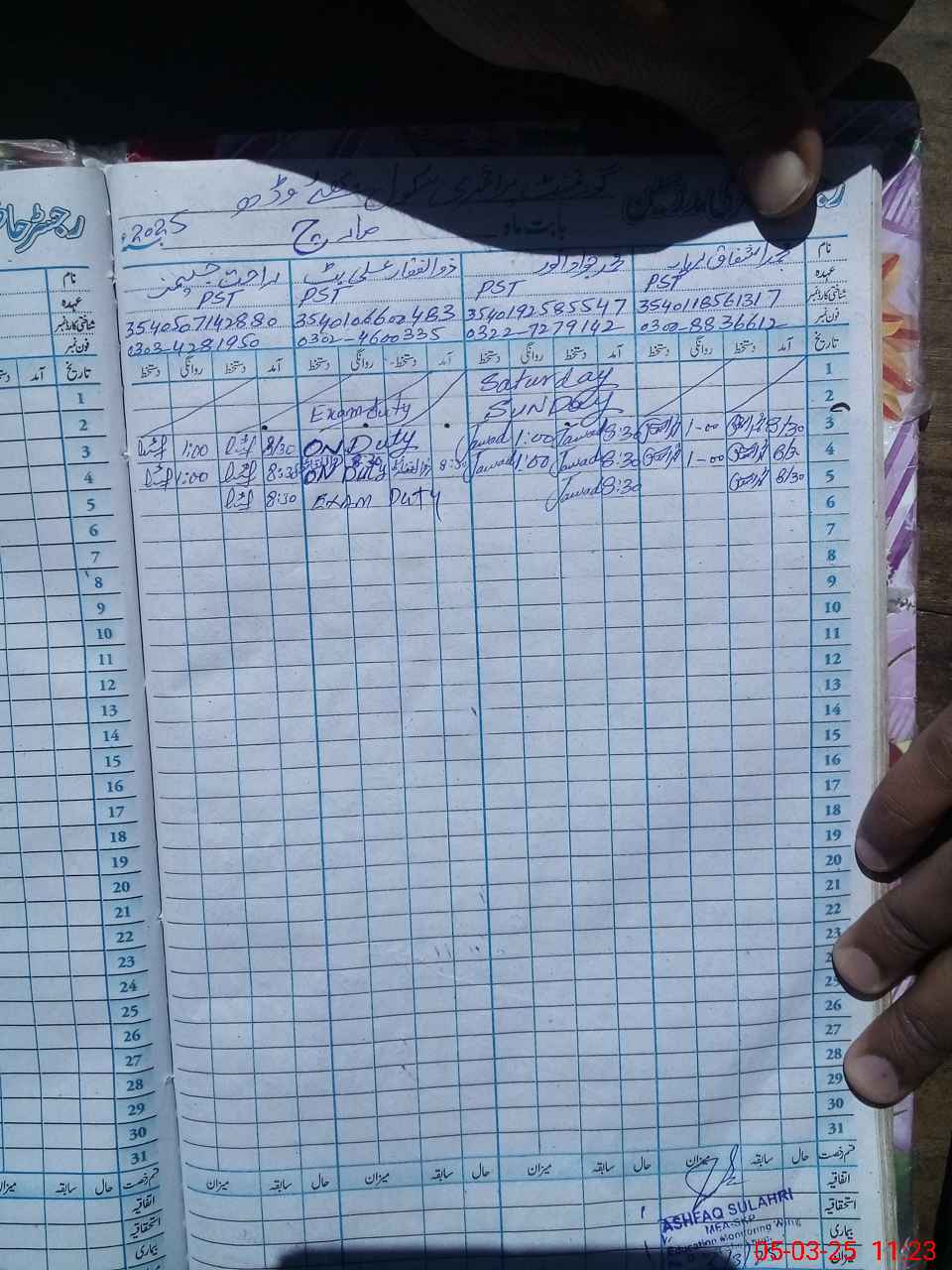 | Name: Mu**** Ja**** Designation: (School Headmaster's/Headmistress's) PST(Science) Phone/Cell Number: 03**** |