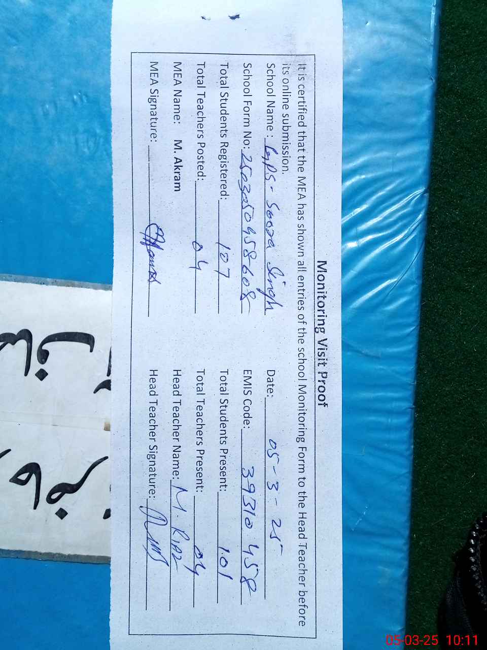 | Attendance Register | Head Teacher | MEA with School | Visit Proof |
