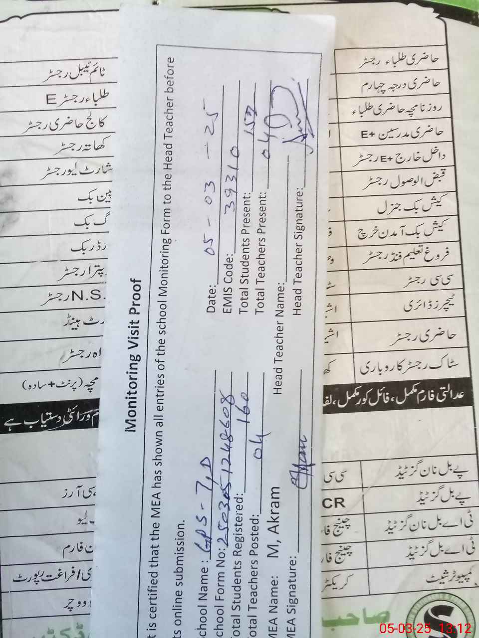 | Attendance Register | Head Teacher | MEA with School | Visit Proof |