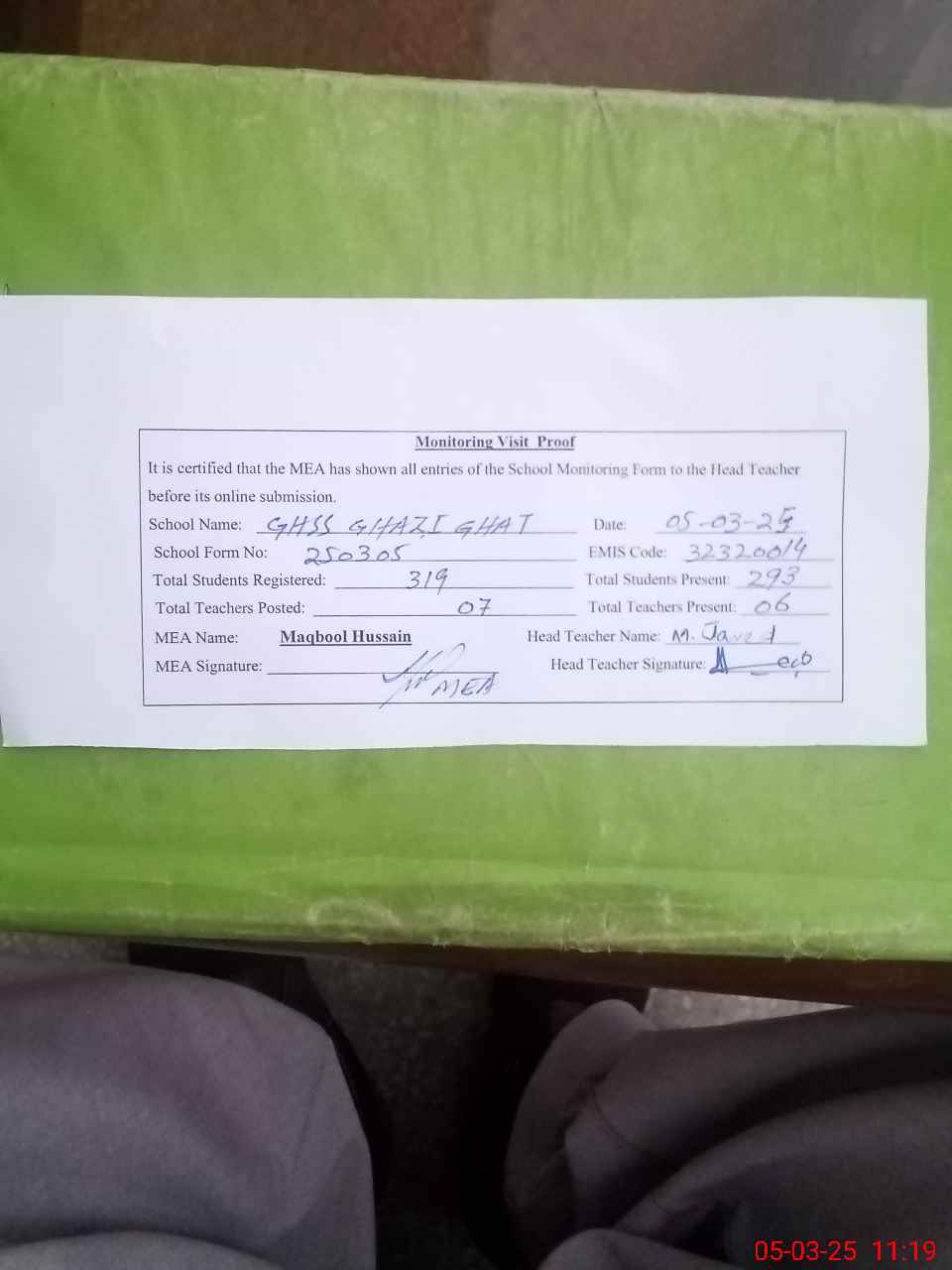 | Attendance Register | Head Teacher | MEA with School | Visit Proof |