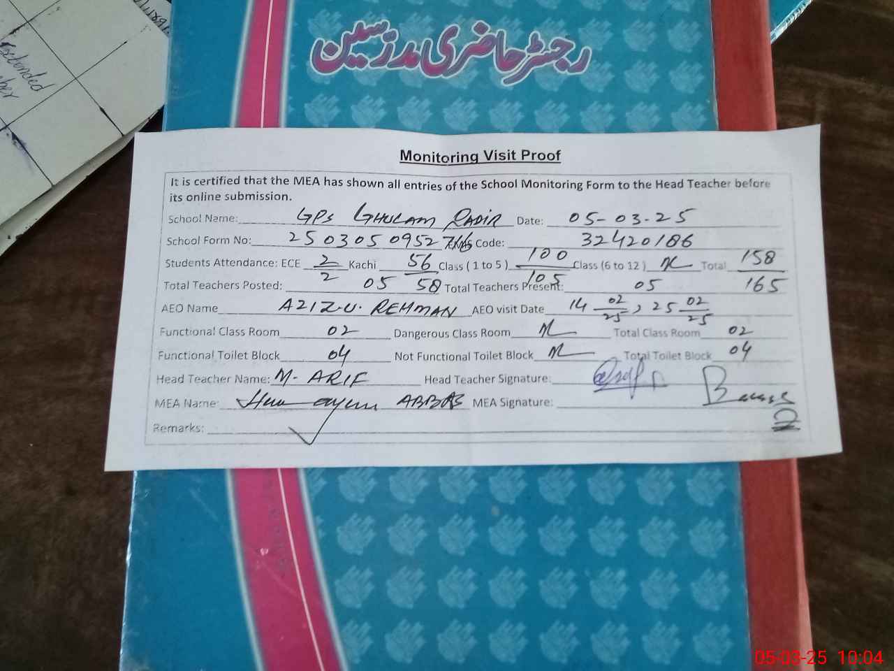 | EMIS Code: 32420186 | Name of School: GPS GHULAM QADAR | |||