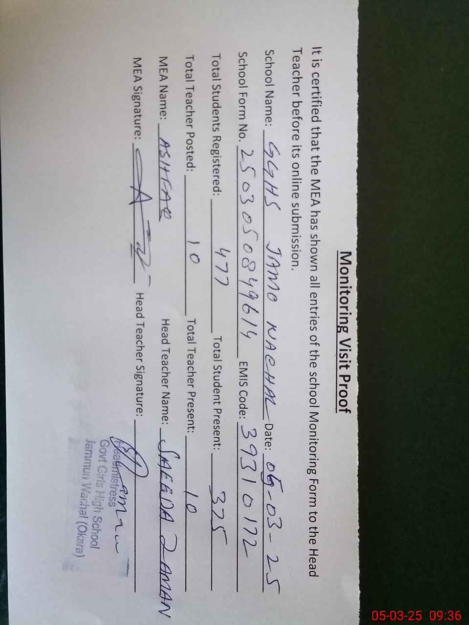 | Attendance Register | Head Teacher | MEA with School | Visit Proof |