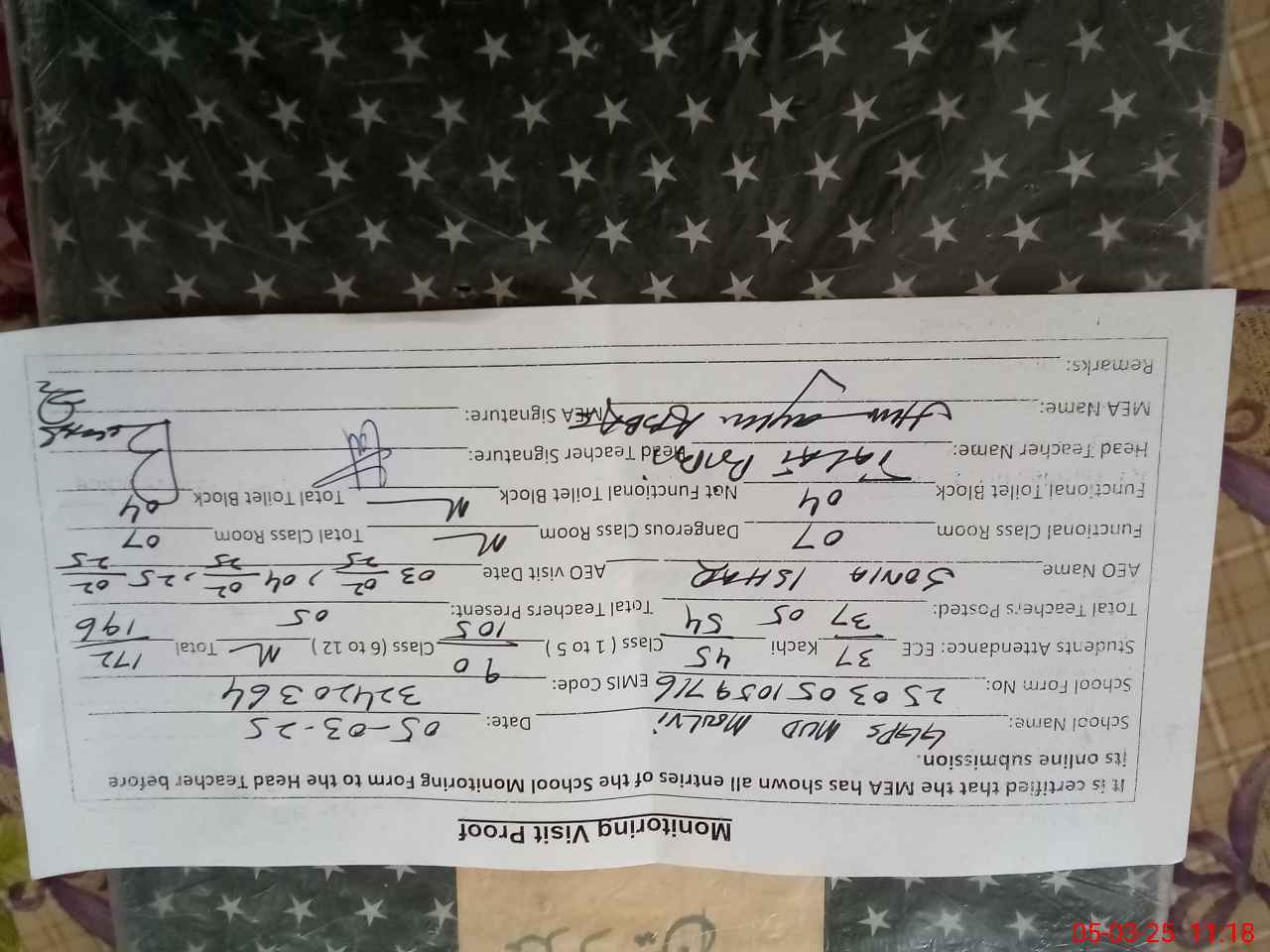 | Attendance Register | Head Teacher | MEA with School | Visit Proof |
