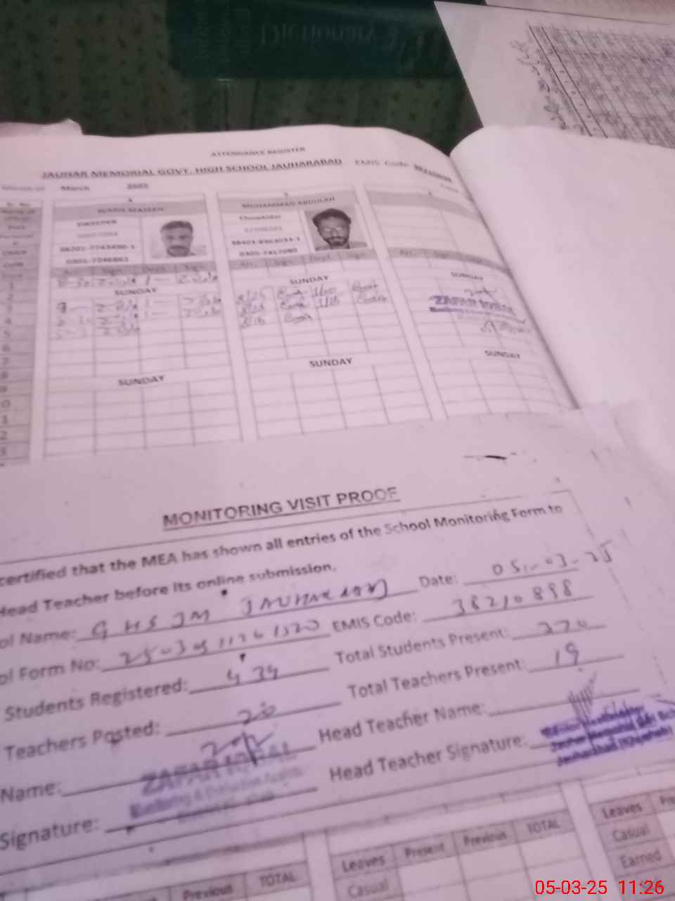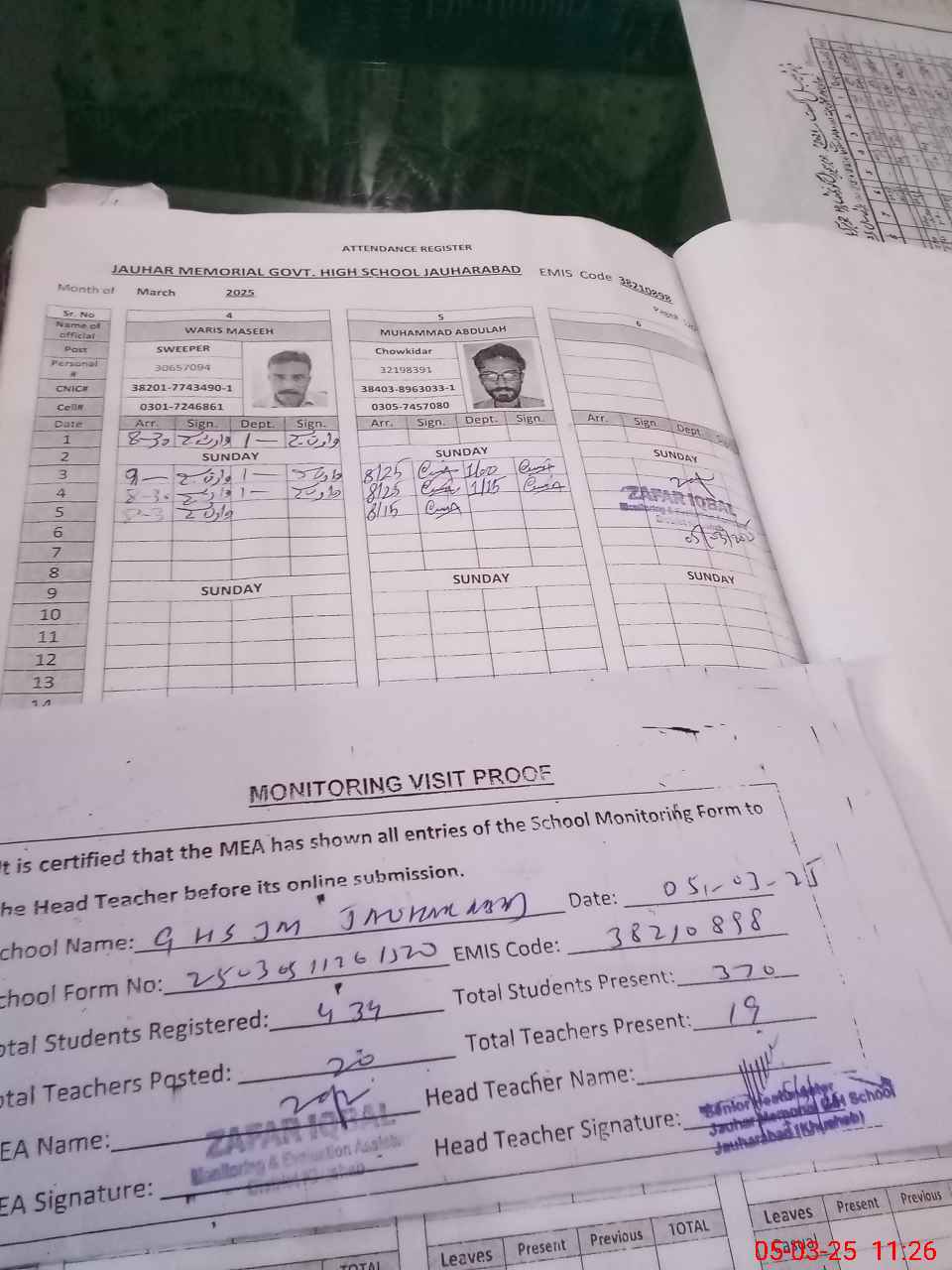 | Attendance Register | Head Teacher | MEA with School | Visit Proof |