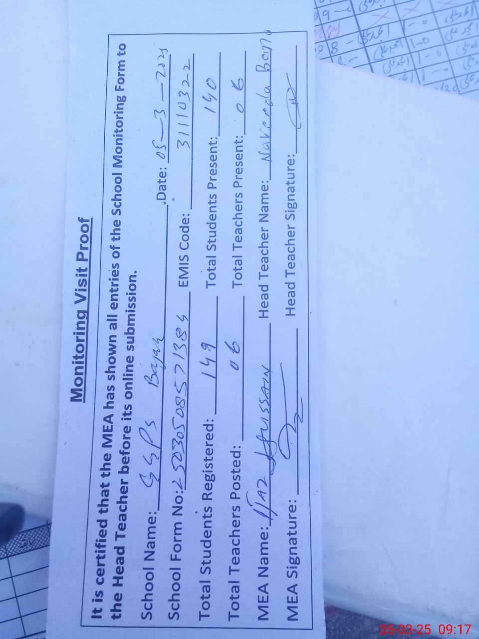 | Attendance Register | Head Teacher | MEA with School | Visit Proof |