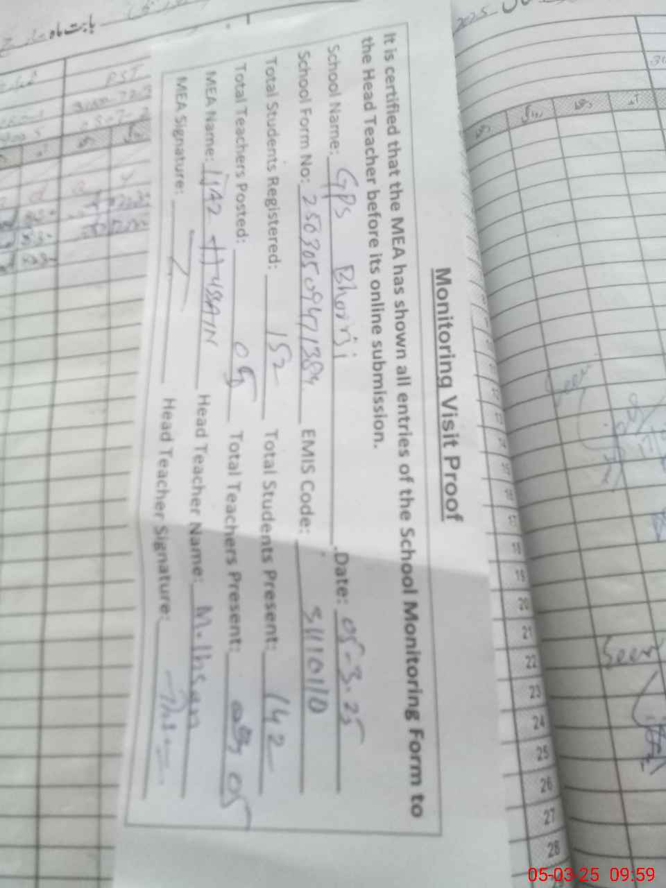 | Attendance Register | Head Teacher | MEA with School | Visit Proof |