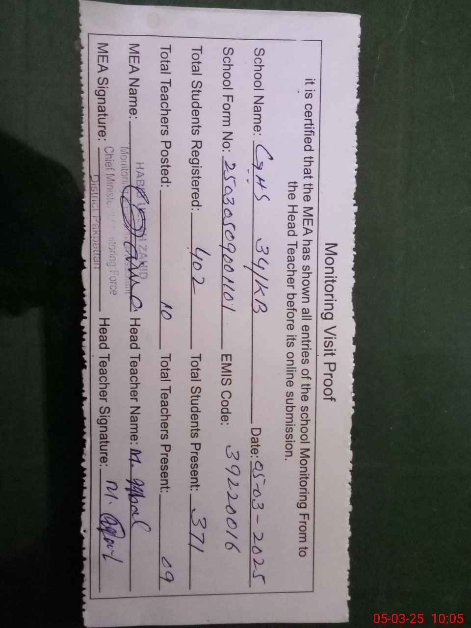 | Certified that this School was Inspected by the Undersigned MEA/DMO Today and the Information Stated Above is as Per Record. | |||||