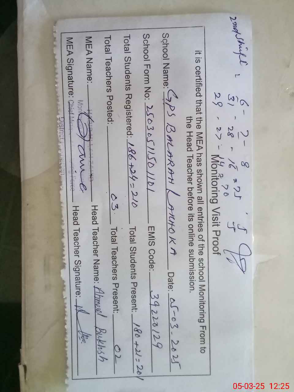 | Certified that this School was Inspected by the Undersigned MEA/DMO Today and the Information Stated Above is as Per Record. | |||||