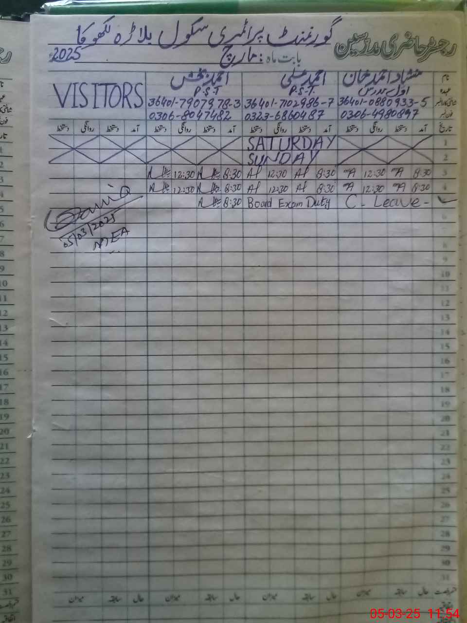 | 36**** | Ah**** Al**** | 2 | 2 | 0 | 0 | 0 | 0 | 0 | 0 | 0 | 0 | 0 | Exam Duty |