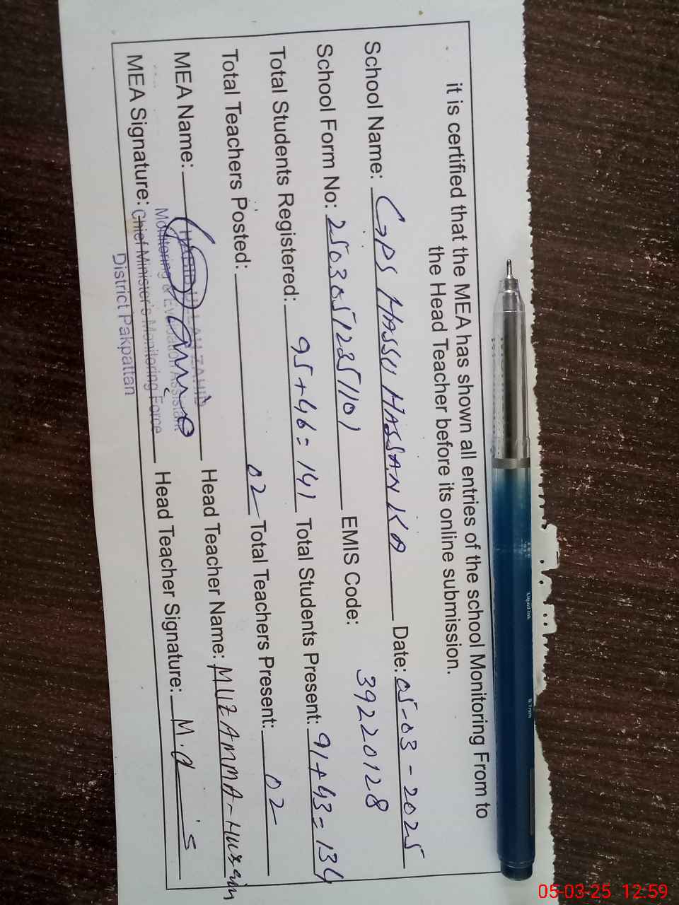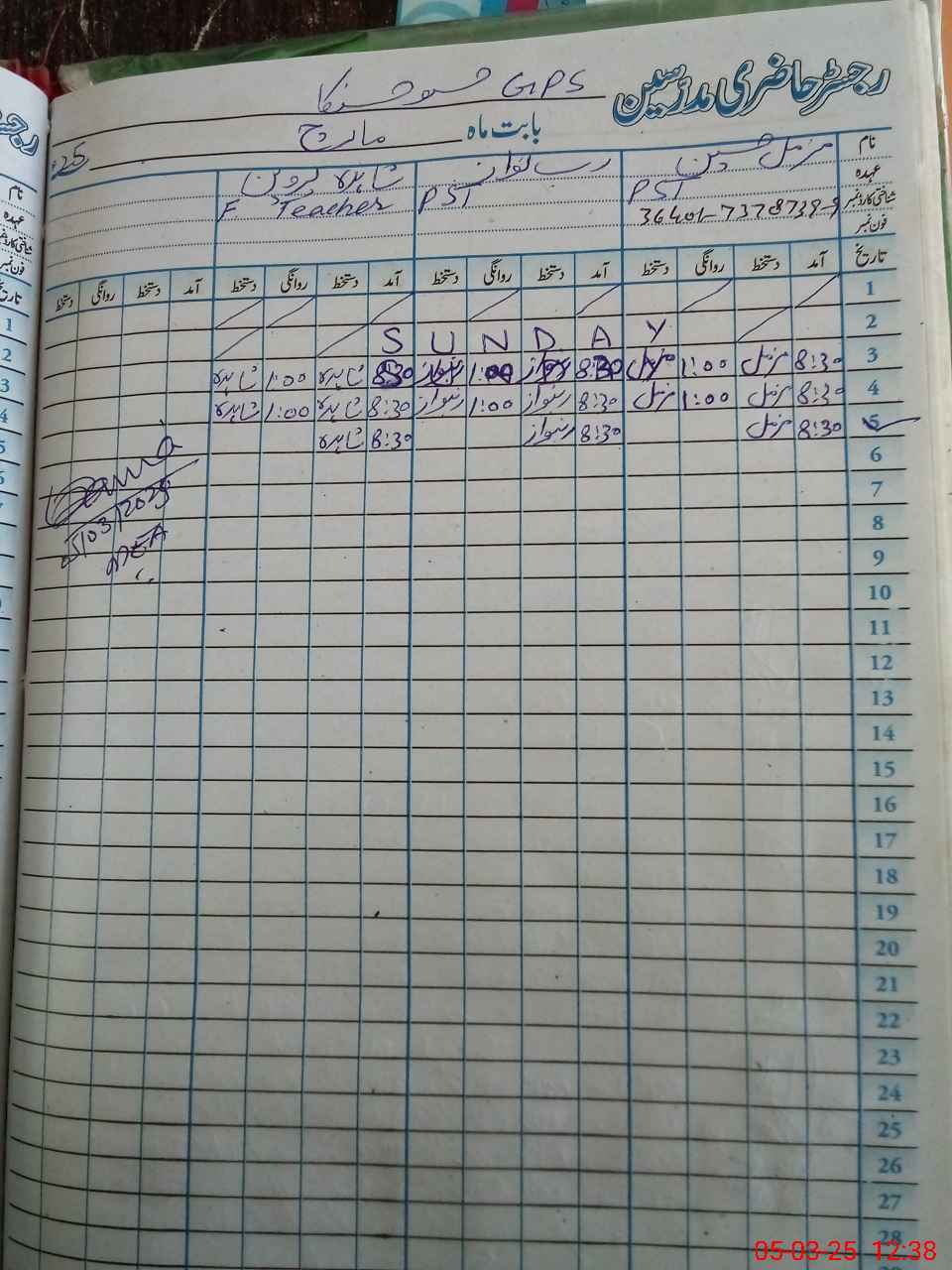 | Name: MU**** HU**** Designation: (School Headmaster's/Headmistress's) PST Phone/Cell Number: 03**** |