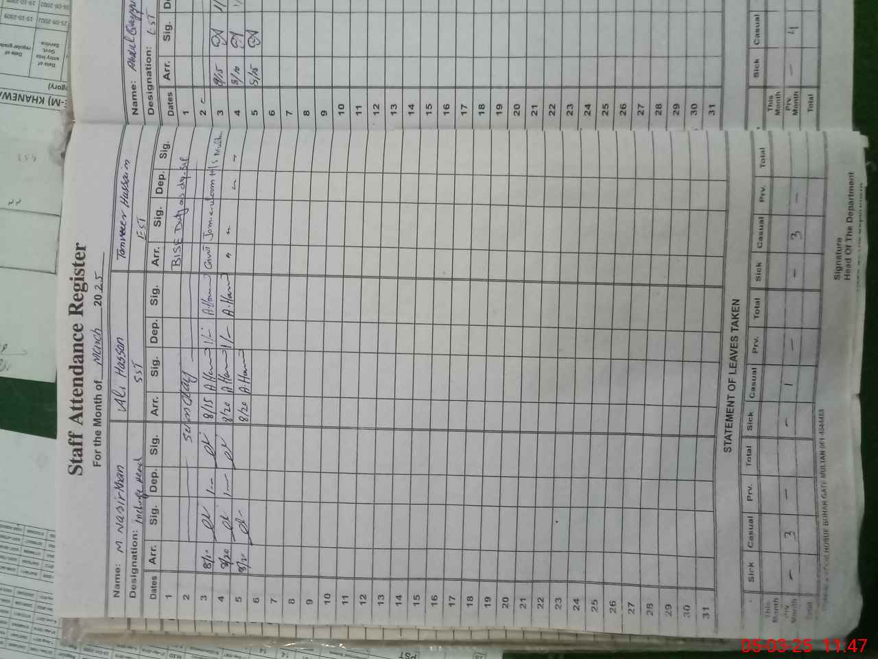 | CNIC | Full Name | Designation | R/C | Absence During Last Calender Month |