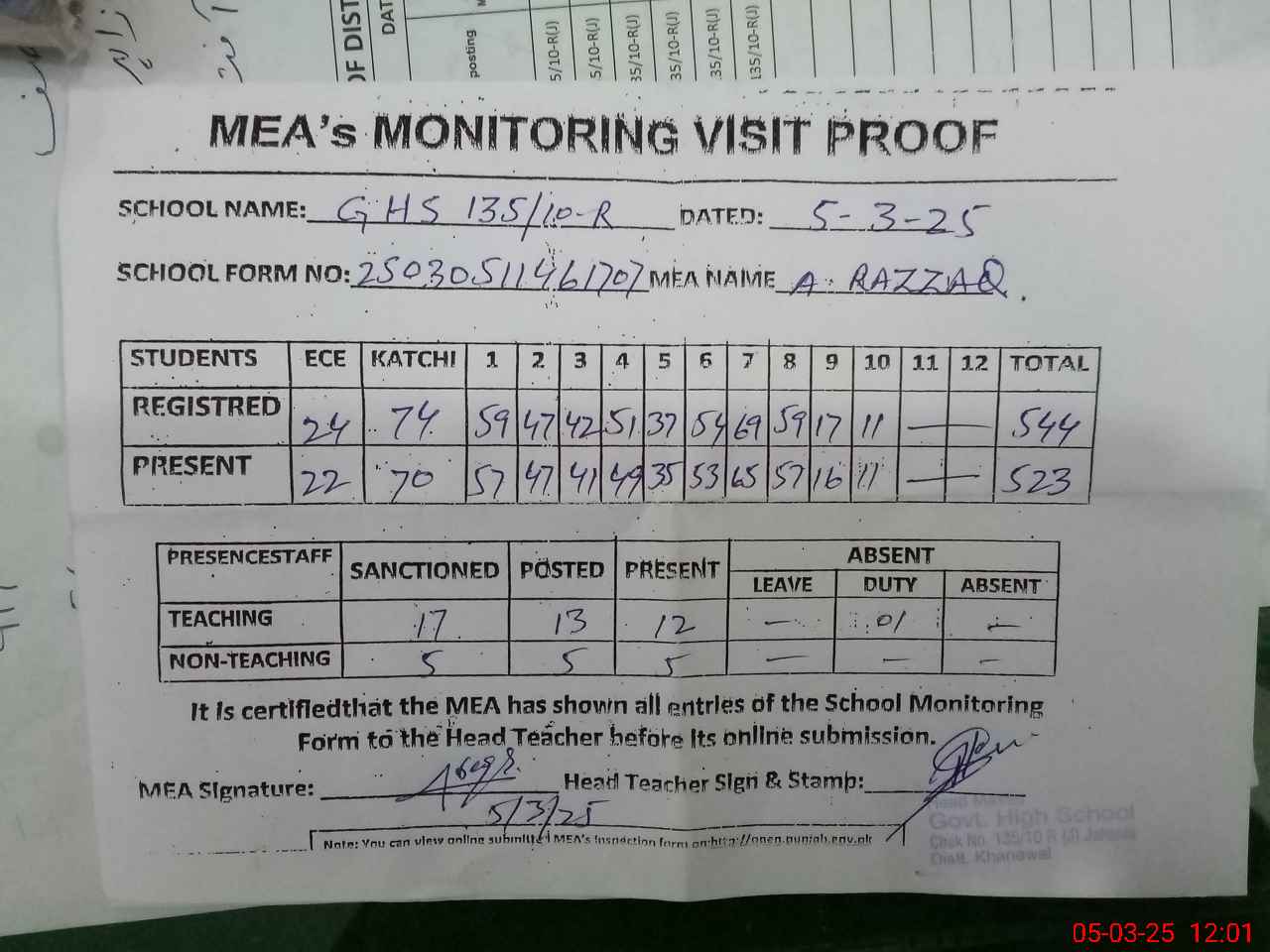 | Attendance Register | Head Teacher | MEA with School | Visit Proof |