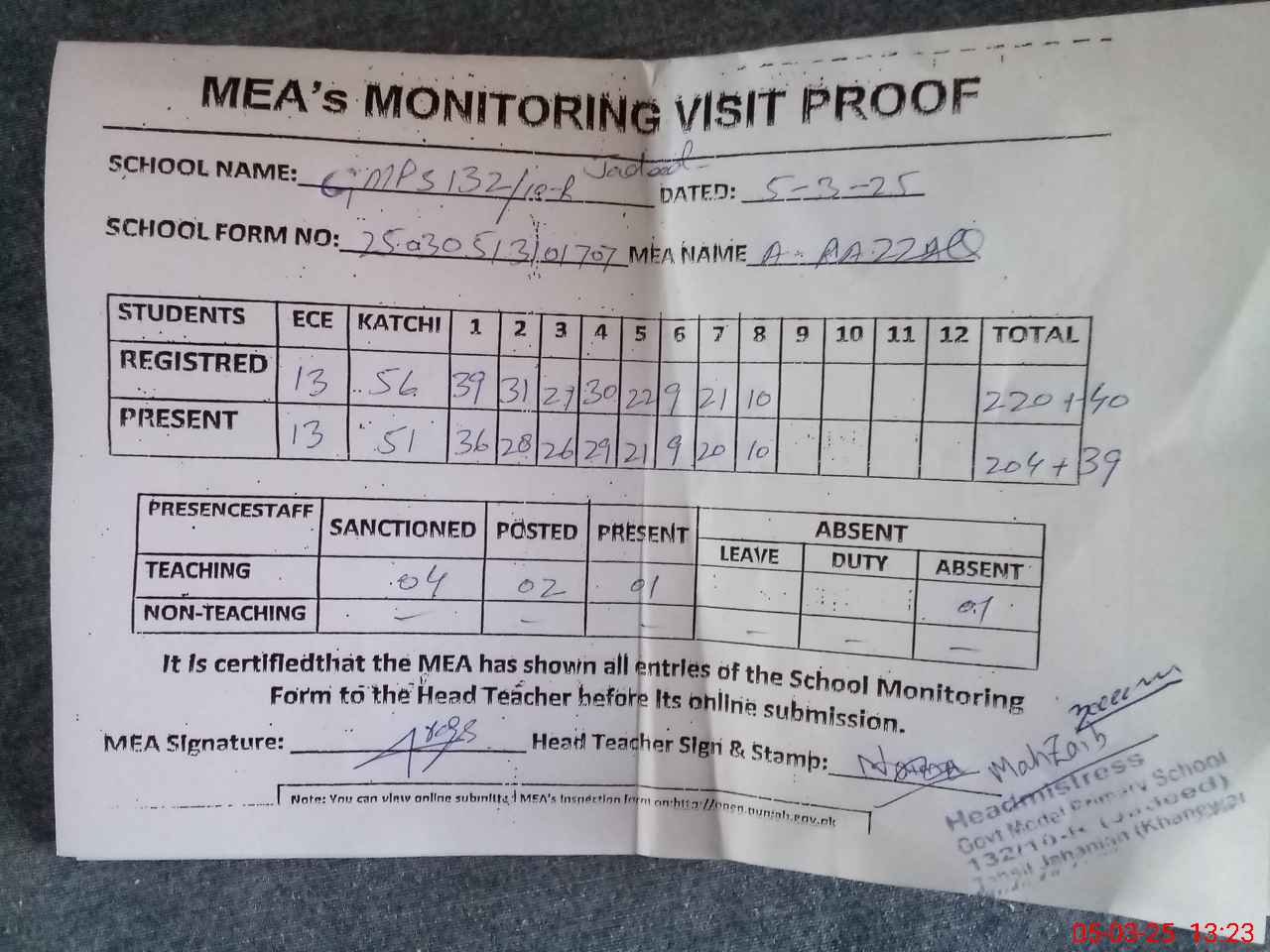 | Attendance Register | Head Teacher | MEA with School | Visit Proof |