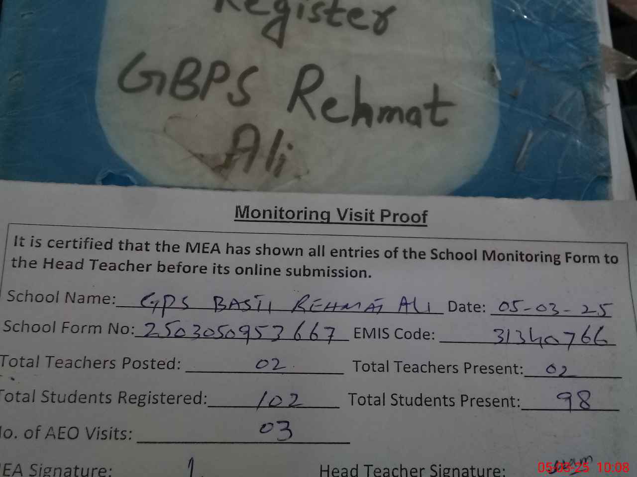 | Attendance Register | Head Teacher | MEA with School | Visit Proof |